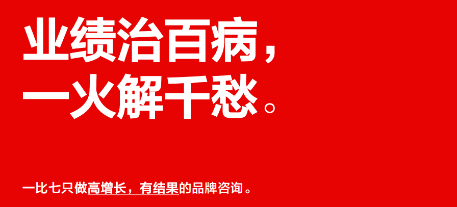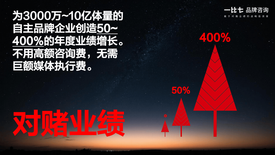 一比七作为业绩暴涨的品牌全案策划服务商,不是提供一份昂贵的咨询报告了事,而是以业绩增量提成为盈利模式,与客户深度捆绑,共同下注未来,跟客户一起在市场上打仗拿结果。