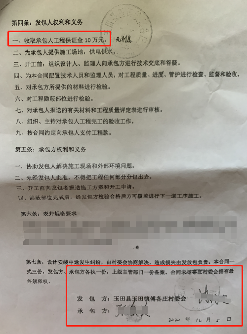 记者注意到,施工合同上没有盖承包方公章,只有张奎英的签名和手印。李宝生称,不记得承包方公司名字了,“签名就中了,农村都这样签。”